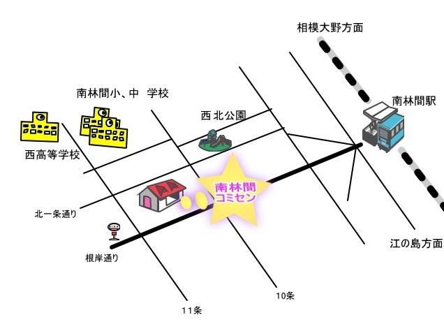 南林間駅西口発の路線バス(神奈中バス、相鉄バス)にて、「11条バス停」下車、約5分です。南林間駅西口発の路線バスは、すべて「11条バス停」を経由します。
